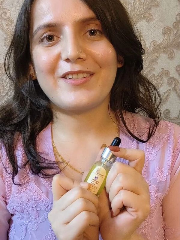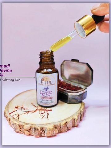 Oil is Infused with Pure Saffron, Sandalwood, Licorice root, Manjistha, Pollen of Lotus flower, Vetiver root, Neem, Lemon, Calendula, Arnica.